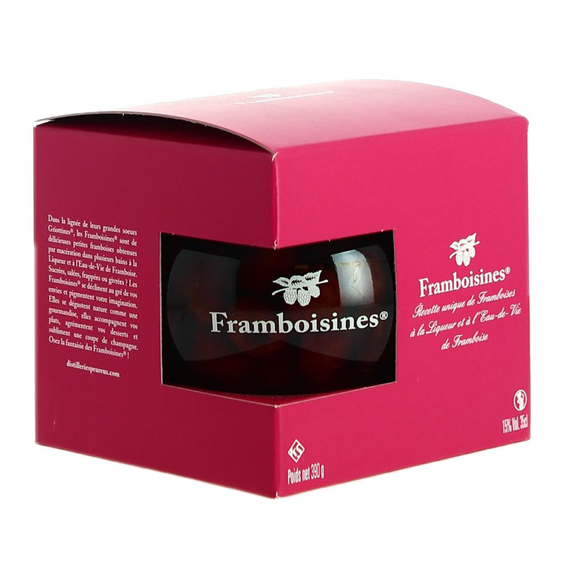 Framboisines 35cl box by Distillerie Peureux, a product 100% natural, without dye or preservative, the Framboisines are delicious small raspberries macerated with liquor and Raspberry brandy. Gourmets will find all the aromatic wealth of raspberry, all the firmness of this little fruit so charming, bursting with color and flavor and whose successive macerations have subtly highlighted its taste so fragrant.