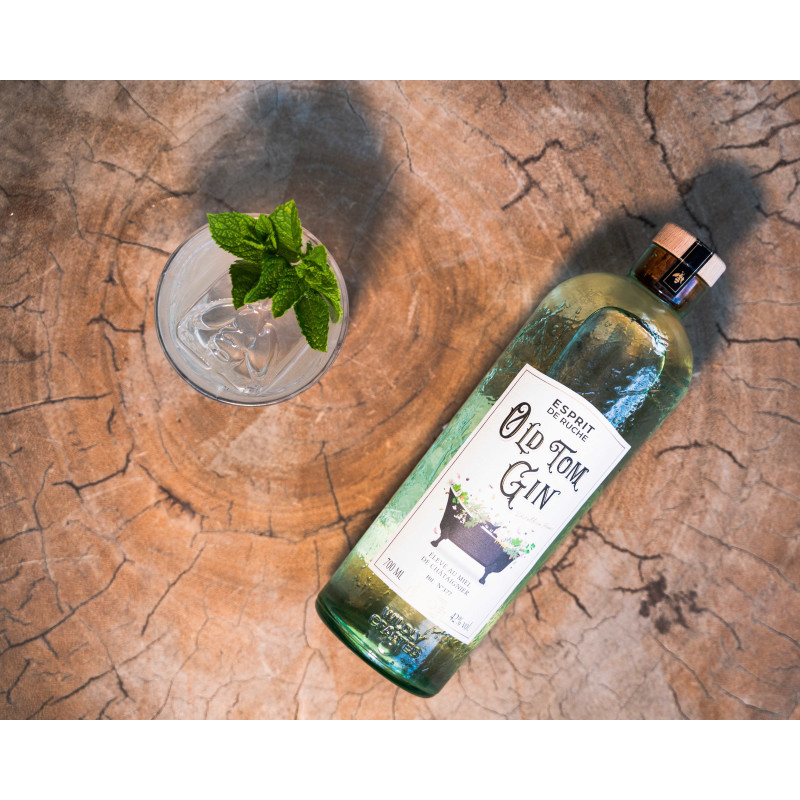 This OLD TOM Gin by Esprit de Ruche is the result of distillation using 11 botanicals, followed by meticulous aging with organic chestnut honey for 3 months.