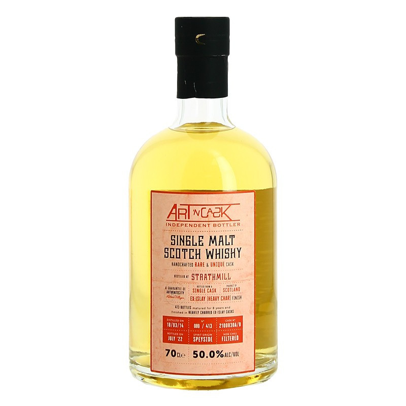 Whisky ART N CASK STRATHMILL Single Cask aged in ex-Islay whisky HEAVY CHAR casks. Distilled in March 2014 and bottled in July 2022. An 8-year-old Speyside Single Malt that was produced in 413 bottles. These whiskies and casks are carefully selected by Patrice Villeger. Single Malt is non-chill filtered from cask no. 2100830A/B.
