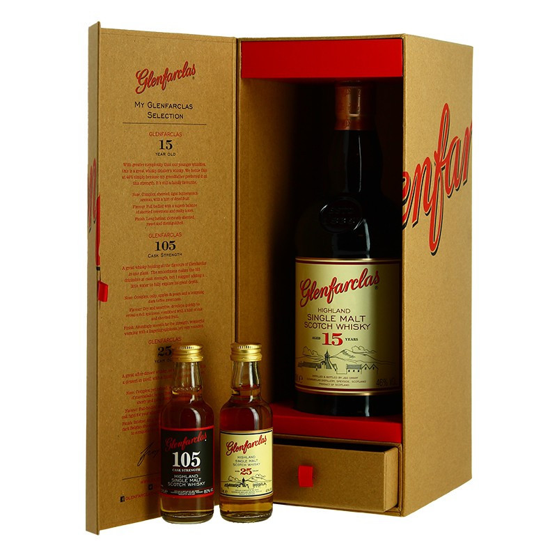 Whisky GlenFarclas 15 years + a 5cl mini bottle of Glenfarclas 105 and a 5cl mini bottle of Glenfarclas 25 years.