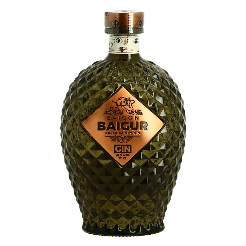 Baigur Saigon Gin from Vietnam, presented in a beautiful bottle reminiscent of the dragon fruit. This gin showcases around fifteen botanicals and fruits cultivated in Vietnam, including the lotus flower, Buddha's hand, juniper berries, citrus, lemongrass, anise, and licorice.