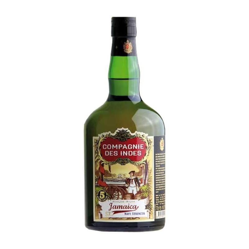 COMPAGNIE des INDES JAMAICA NAVY STRENGTH 57° 70 cl, a tribute to the traditional rums served to the British Royal Navy. Bottled at 57°, this powerful, full-bodied rum embodies the spirit of adventure and robustness associated with the navy.