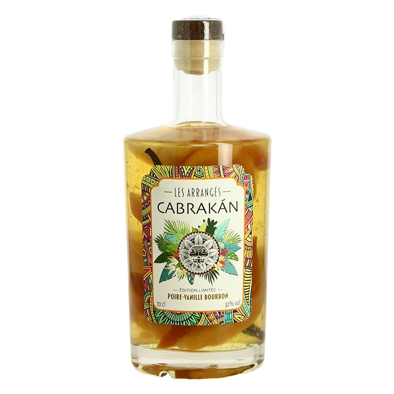 CABRAKAN Pear and Vanilla Arranged Rum. This carefully prepared artisanal Norman rum contains authentic pieces of pear. The fruit fragments have been meticulously hand-inserted into the 70cl bottle. The Guadeloupean white rum was left to macerate alongside the fragments of pear, vanilla, and cane sugar. This infusion provides a palette of rich and extraordinary aromas.