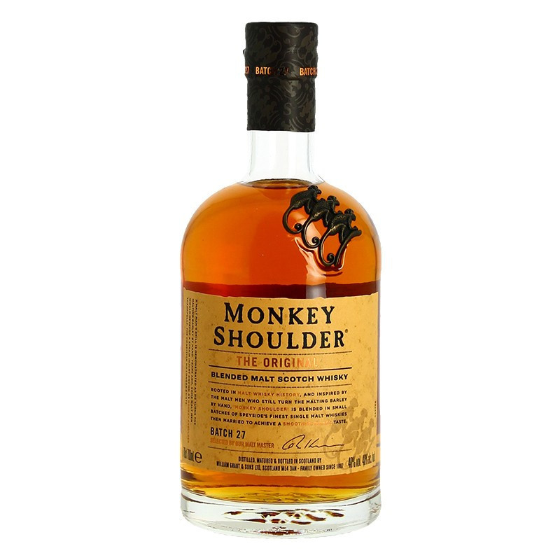 This MONKEY SHOULDER Blended Malt Scotch Whisky, 70 cl, is a fruity whisky, evoking a sense of lightness in aromas and flavors on the palate. The yeast used plays an essential role in the final result, and in general, when a whisky is neither peated, smoky, nor iodized, fruity aromas can be sensed. The major fruit families are stone fruits like peaches, pears, and apples; berries; citrus fruits; as well as dried fruits like walnuts and fresh hazelnuts.