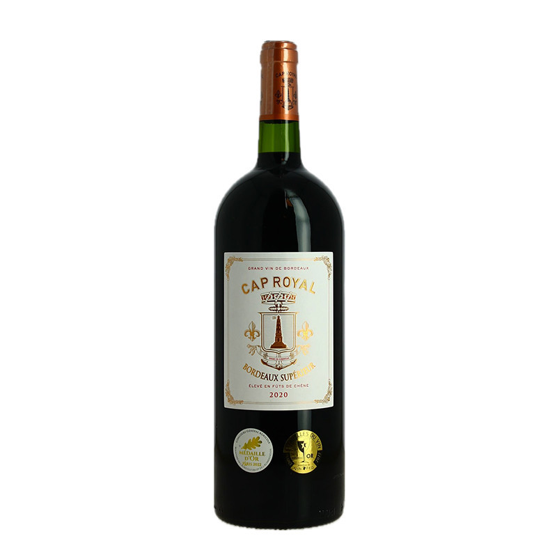 Cap Royal Bordeaux Rouge 2020 Magnum is a wine that epitomises the elegance and finesse of Bordeaux wines. Made from Merlot and Cabernet Franc grapes, this 2020 vintage is distinguished by its intense ruby-red colour and purplish tints. Part of the wine was matured in barrels for 12 months and the rest in stainless steel vats. On the nose, it reveals a bouquet of rich, complex fragrances, blending notes of fruit, vanilla and pleasant peppery notes with subtle hints of cedar wood.