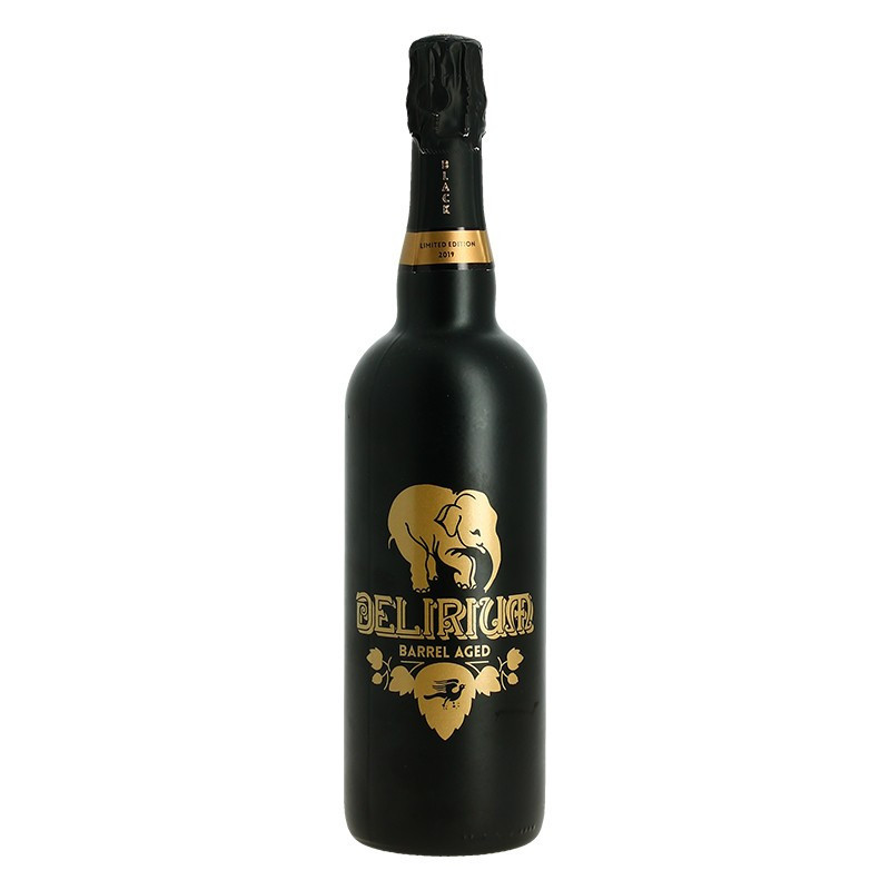 Délirium Black Barrel Aged Beer 75 cl. This beer is a blend of Delirium Nocturnum beer and Delirium Noël beer. This blend spends 9 months in oak barrels that previously contained bourbon. The result gives an amber beer with spicy notes and hints of vanilla.