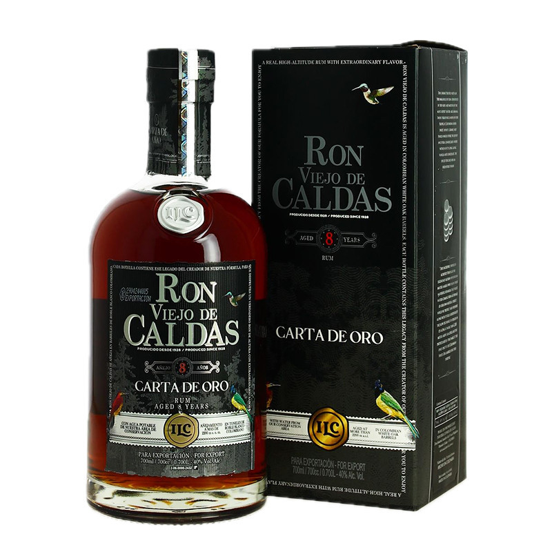 RON VIEJO de CALDAS 8 Years Carta de Oro . This amber rum from Colombia is very popular in South America. Made from sugar cane, it is aged for 8 years in white oak casks from the surrounding forests.