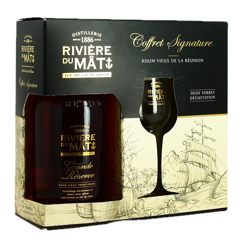 The Rhum Rivière du Mât Grande Réserve 70cl 40° with 2 Glasses set includes a 70cl bottle of old rum at 40°, accompanied by two tasting glasses, ideal for enjoying this rich, aromatic rum from Réunion Island.