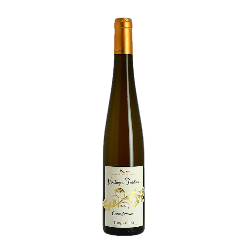 Gewurztraminer Vendanges Tardives 2022 50CL 14° Turckheim, this sweet bench wine will convince you with its fruity and spicy aromas. Its complexity and perfect balance will win you over.
