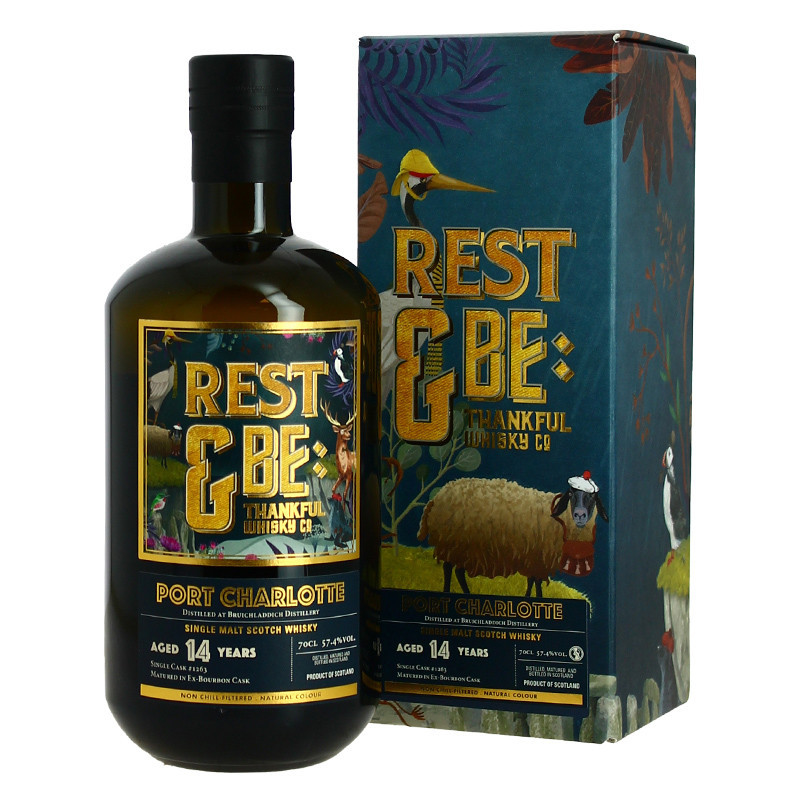 Port Charlotte Rest and be Thankful 14YO 2009 Islay Single Malt Scotch Whiskey. This single cask whiskey by Fox Fitzgerald Brands comes to us from the Bruichladdich distillery located on the island of Islay. It is quite rare to point out that Bruichladdich is very rarely found under the label of an independent bottler. this bottle reveals what this distillery can offer in terms of very peaty. This whiskey spent 14 years in an ex-Bourbon cask, bottled at cask strength.