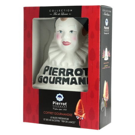 The PIERROT Gourmand bust + 40 "Fer de Lance" lollipops 524g is the perfect set for sweet lovers. The elegant and decorative PIERROT bust is accompanied by 40 delicious "Fer de Lance" lollipops with an authentic taste, ideal for parties and special occasions.