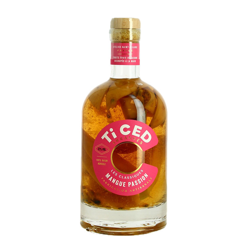 Mango Passion Ced Rum Punch 70 cl. This arranged rum is the perfect alliance between the mango which brings the unctuous and sweet side on the one hand, and the passion fruit which also brings the sugar but also the acidity on the other hand. These two exotic fruits associated with AOC Rum from Martinique and Bourbon vanilla from Madagascar make this arranged Rum a pure delight straight from the islands. Olfactively and tastefully, mango and passion fruit blend perfectly, sometimes one brings roundness and gluttony, sometimes the other acidity and freshness. But of this exotic samba of flavors, it is the mango that ultimately leads the dance.