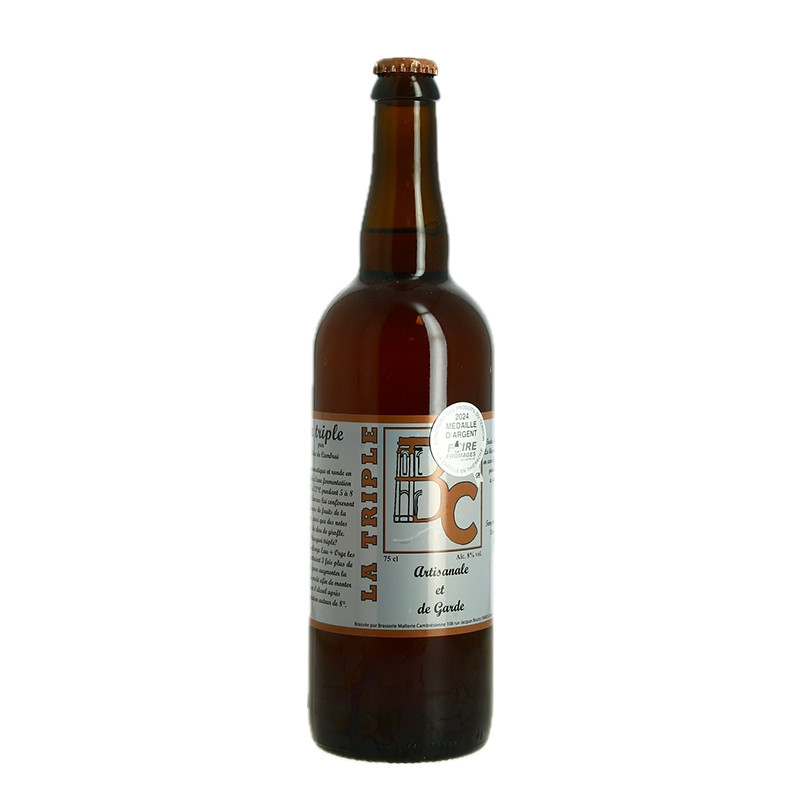 Bière de Cambrai Triple, Bière Artisanale de Garde. This triple lager, 8.5% vol. seduces with its aromas of candied fruit . Brewed with malts and It has a powerful palate, combining malty roundness and alcoholic complexity. Its and its fine sparkle make it a gourmet beer, ideal for lovers of strong, structured beers.