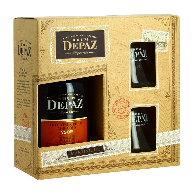 Agricultural rum from Martinique, DEPAZ VSOP 70 cl rum in gift box + 2 glasses