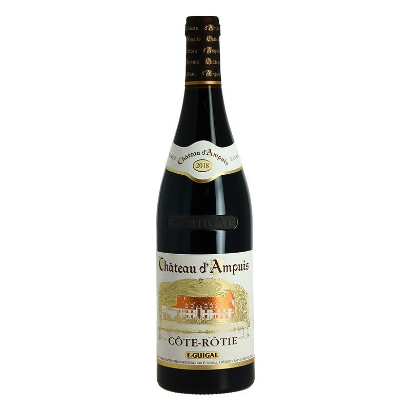 Côte Rôtie Château Ampuis 2018 by Guigal has a dark and deep color with mauve reflections, aromas of spices, black fruits and delicate aromas of wood. The nose is dense, expressive and intense. Tannic and racy wine. Aromas of prunes, blackberries and vanilla. Mouth powerful, concentrated and structured. Wine from a muscular and tannic vintage, forged by a warm climate. The tannins are very strong but softened by prolonged ripening under wood. Winemaking in closed stainless steel tanks. Temperatures of controlled alcoholic fermentations. 4 week vatting time