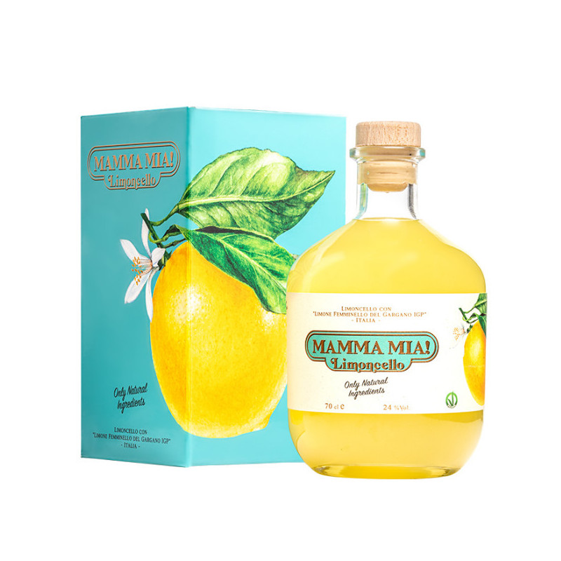 Limoncello Mamma Mia is a liqueur made from Apulian lemons, specifically the Femminello del Gargano variety, offering a rich and lingering taste experience. On the palate, it seduces with its freshness and roundness, with a typical minerality and a lingering finish.