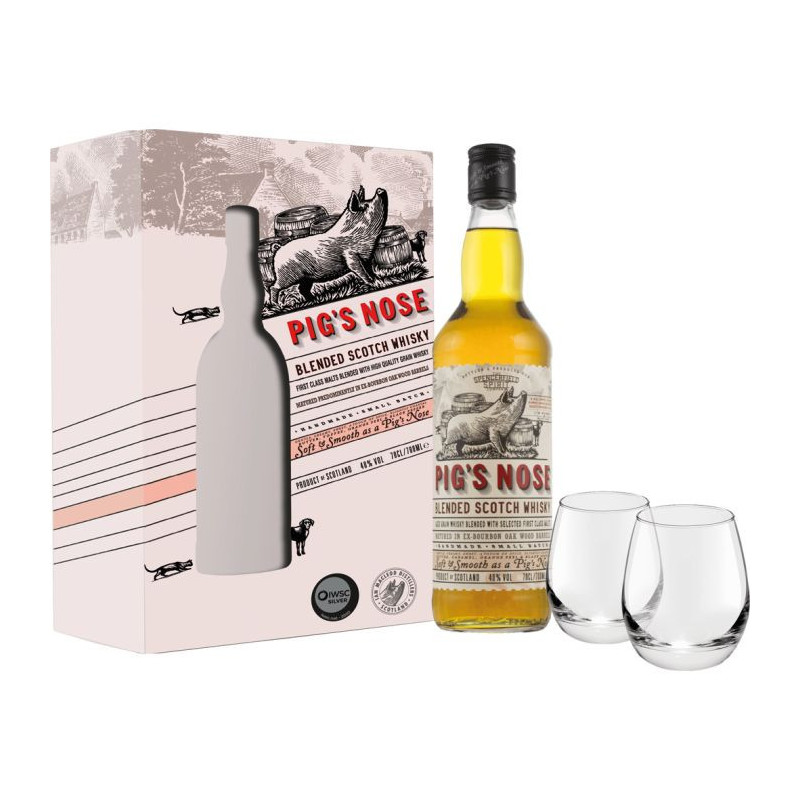 Blended Whiskey PIG'S NOSE in gift box + 2 Glasses. This Blended Scotch whiskey is the result of a blend of malts from the regions of Speyside, Islay and the Lowlands. The majority of this blend, however, is made up of Invergordon whiskey aged mainly in ex-bourbon barrels.