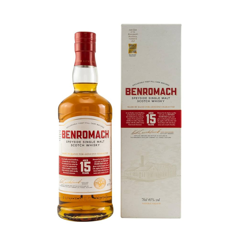 Aromas and flavours: Benromach 15 Year Old Single Malt Whisky is an exceptional drink that is seductive from the very first sip. On the nose, it reveals rich aromas with a hint of peat and smoke, followed by a touch of caramel and vanilla. On the palate, the peat and smoke flavours are complemented by notes of honey and sweet spices, creating a remarkable harmony of taste. The finish is long and sweet, with a slight hint of spice that lingers pleasantly.