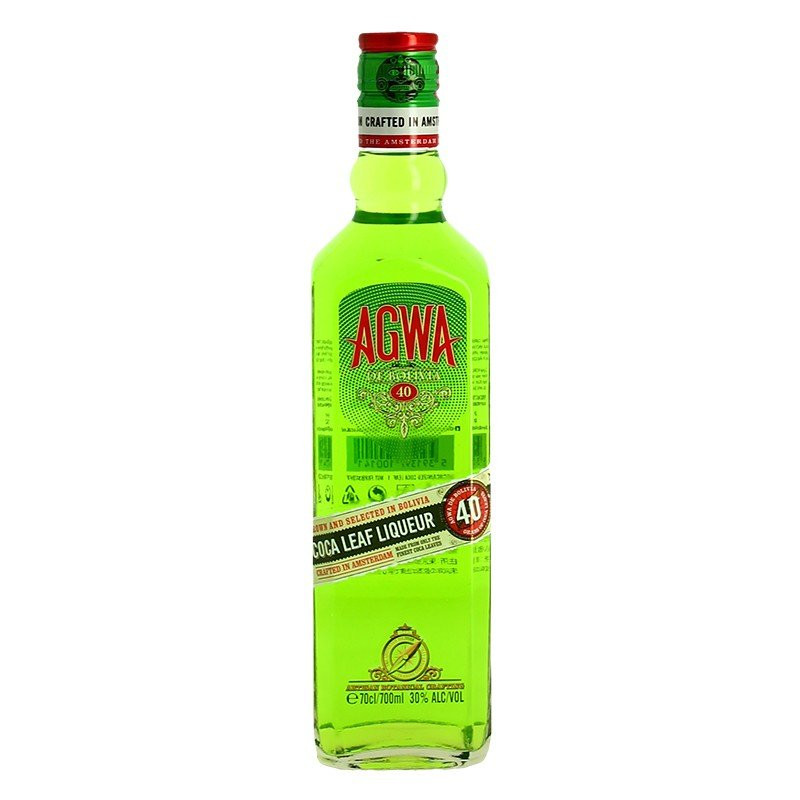 AGWA Bolivia Coca leaf liqueur. Agwa liqueur is a herbal liqueur made with Bolivian coca leaves and 37 herbs and natural plants including green tea, ginseng and guarana.