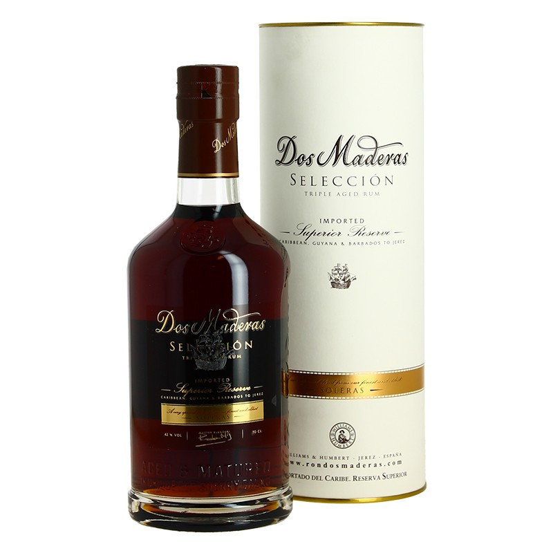 DOS MADERAS Seleccion Triple Aged Superior Reserve Old Rum. This ron is the assembly of Dos Maderas 5+5PX and Dos Maderas Luxus 10+5. The aging period in Jerez de la Frontera takes place in the cellars of Bodega Williams & Hubert.