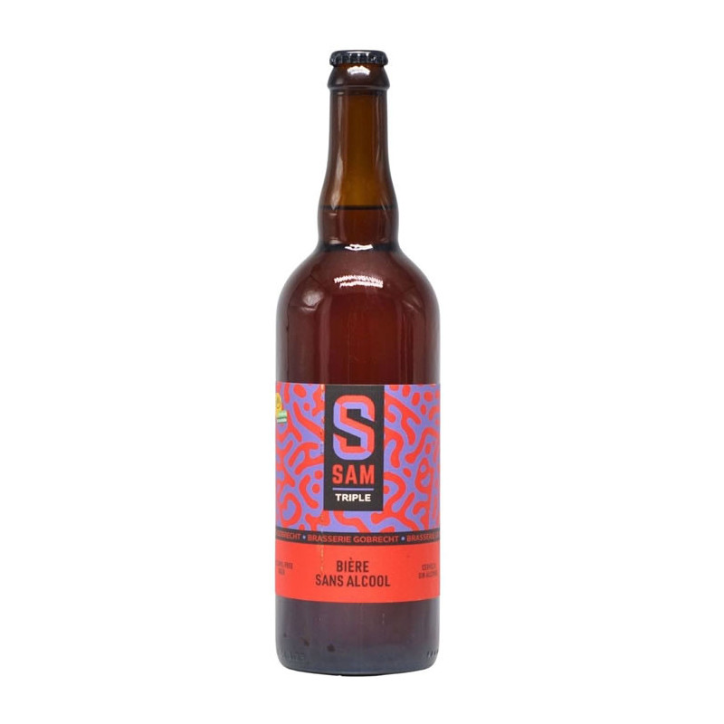 The SAM Triple non-alcoholic 75 cl from Brasserie Motte Cordonnier is a craft beer that reinterprets the Belgian triple style in a non-alcoholic version. It captivates with its brilliant golden colour and lovely effervescence. The nose reveals aromas of cereals, honey, ripe fruit and sweet spices. On the palate, the texture is round and full-bodied, with a well-balanced malty sweetness. An alcohol-free beer that’s perfect for enjoying the pleasure of a traditional triple at any time.