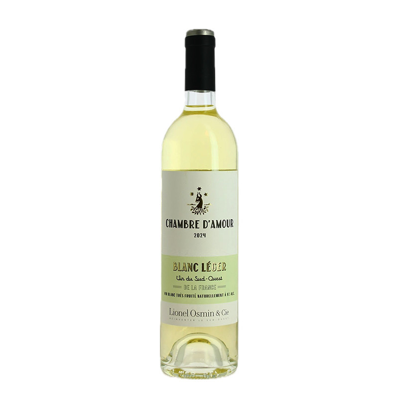 La Chambre d'Amour Blanc Léger 9° designed by Lionel OSMIN is an elegant and refreshing white wine, perfect for relaxing moments and evenings with friends. Made from Gros Manseng and Sauvignon Blanc grapes, this wine has a clear, luminous colour with golden highlights. On the nose, it reveals a delicate aromatic bouquet, with notes of fresh fruit such as apple and lemon, as well as floral touches of jasmine and white flowers.